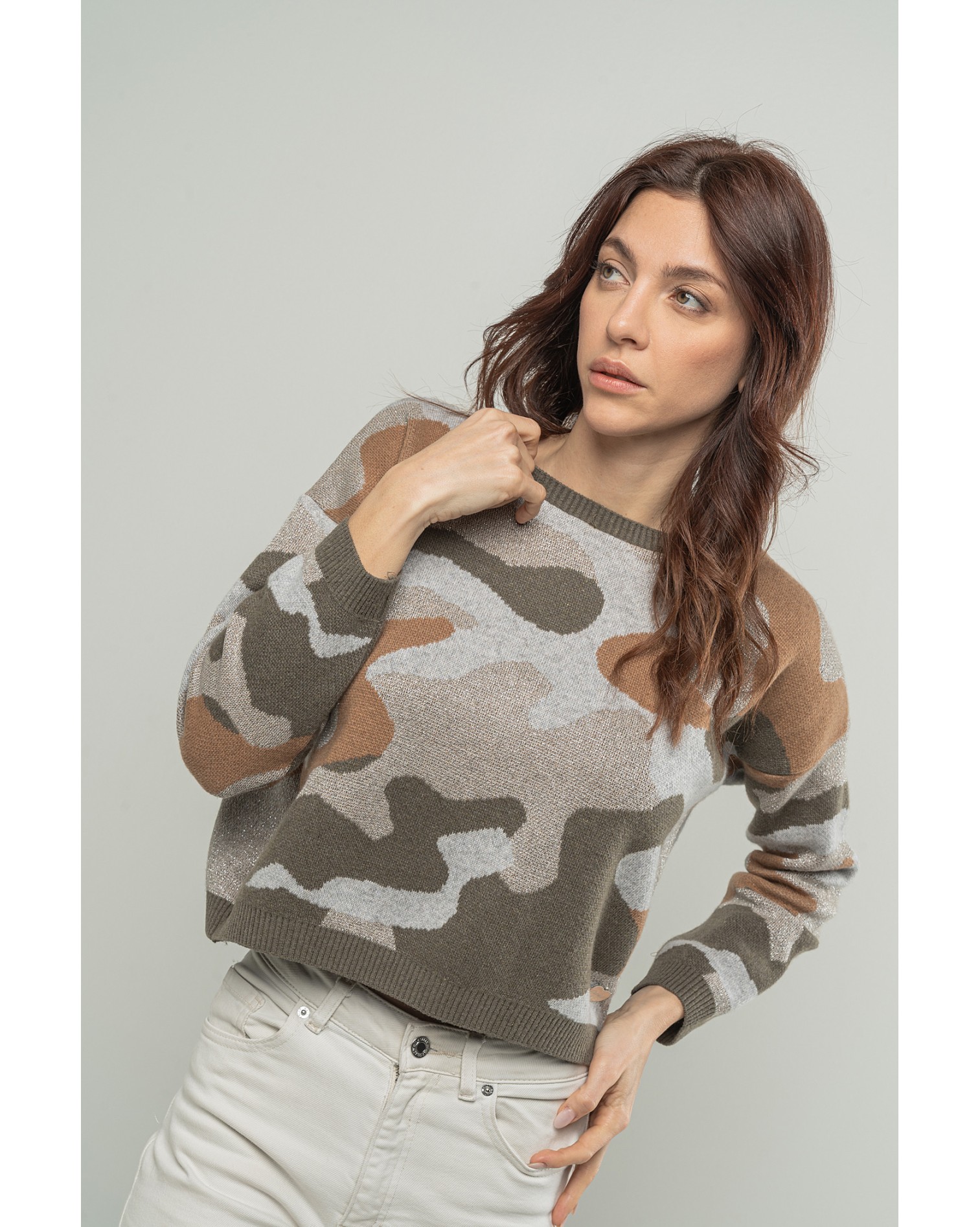 Maglia crop con lavorazione jacquard a motivo camouflage, caratterizzata da un design moderno e distintivo.
