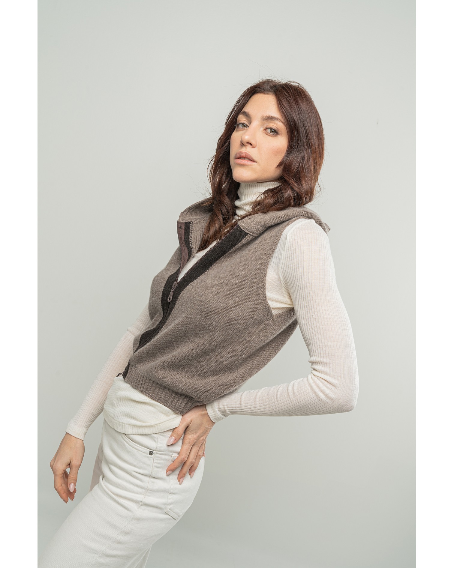 Gilet con cappuccio, prodotto in lana merinos e cashmere.