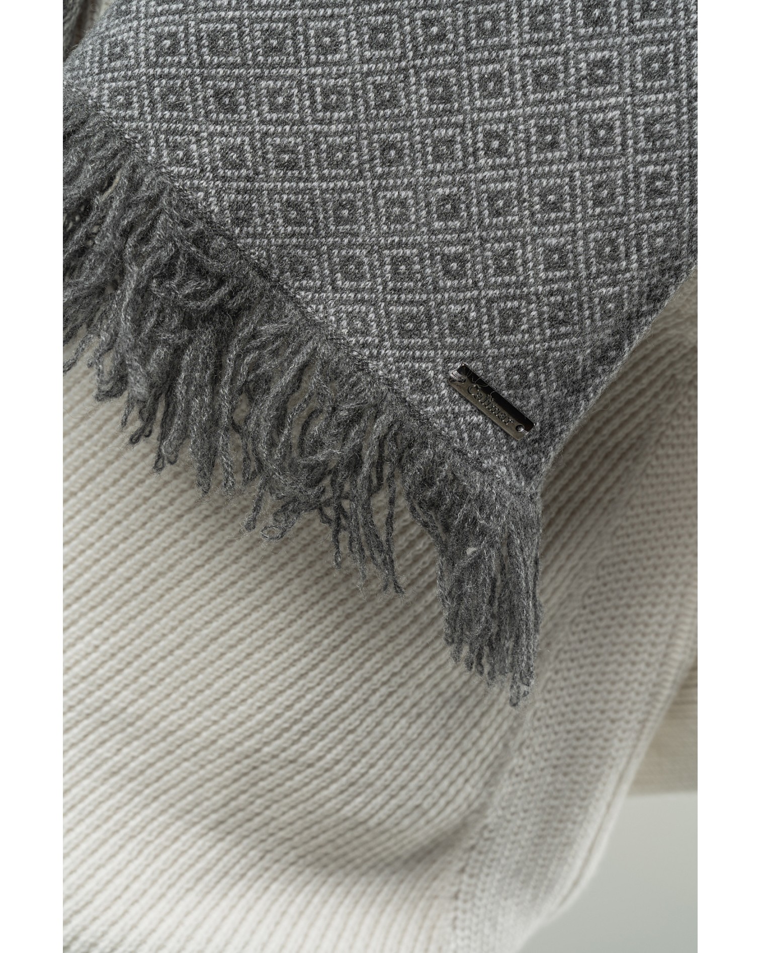 Sciarpa con lavorazione jacquard a rombi e con frange, prodotta interamente in cashmere.