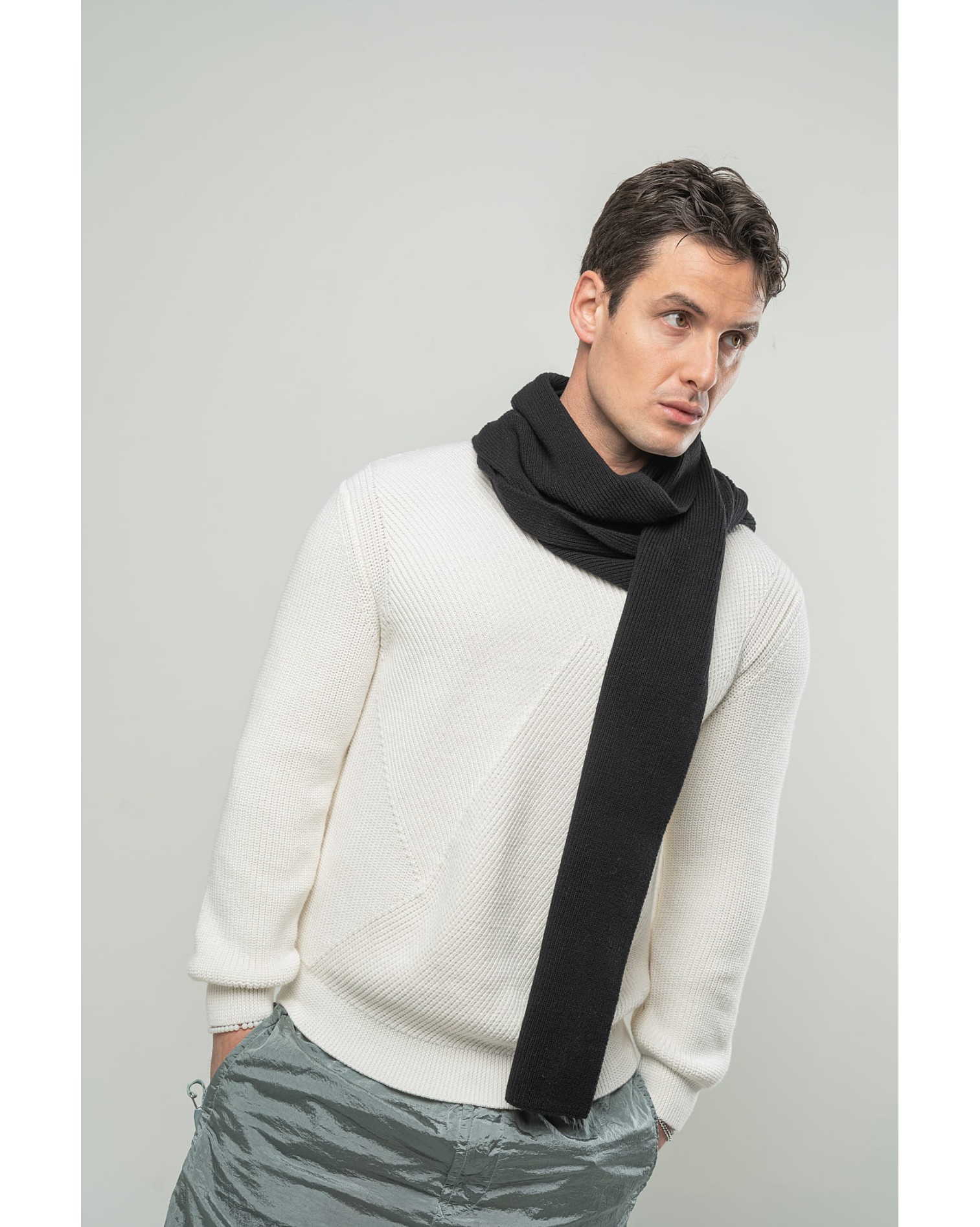 Sciarpa con lavorazione a costine, prodotto interamente in lana merinos.